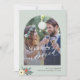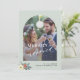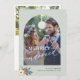 Modern typography script merrily married photo sage green wedding announcement holiday card with arch photo, custom text, and a small Christmas seasonal watercolor botanical floral bouquet.