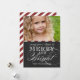 BLACK CHALKBOARD, MERRY AND BRIGHT PHOTO HOLIDAY GREETING CARD | DARK RED STRIPES. ELKE CLARKE© ELEGANT WHITE TEXT ON A CHALKBOARD PRINTED EFFECT BACKGROUND WITH RED AND WHITE DIAGONAL STRIPES PATTERN ON THE BACK. MAY YOUR DAYS BE MERRY AND BRIGHT