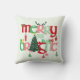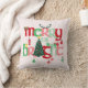 Merry and Bright Christmas in red and green lettering with retro ornaments, Christmas tree, and antlers. Background light pink on side side, light green on the other.