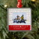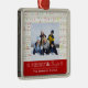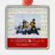 This premium square metal Christmas holiday ornament has a colourful Christmas song music sheet background with a red bottom border. In the middle, you can add your family photograph. Underneath the picture, Merry and Bright is written in between two white ornaments. At the bottom, you can easily personalise this with your family name.