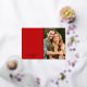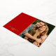 Modern red and real gold foil Christmas tree card with the saying "Merry and bright", a photo, the family name or custom text, current year, and a custom message on the back.