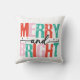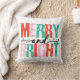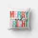 Fun Christmas throw pillow features text of red, teal green, pink, and black that reads Merry and Bright!