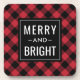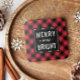 Stylish holiday drink coaster design features a red and black buffalo check plaid pattern with Merry and Bright modern typography design in black and white.