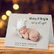 Cute 4 photo Christmas holiday season folded birth announcement card. Your newborn's picture fills the front of the card with "Merry & Bright and up all night!" written in a mix of elegant typography and a stylish script (this text can be moved around in the design tool to suit your photograph). Add their name and birth stats. On the inside, add 3 additional photos, a seasonal greeting to family and friends, and your names.