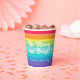Beautiful rainbow Christmas party paper cup in pretty bold colours that reads Be Merry and Bright. Cheerful gay pride themed holiday decorations for an LGBTQ family.