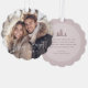 Ornament card featuring your photo and the text "Merry and Bright" in an elegant, casual script font and the year below. Add a custom message on the back. Light rose taupe or custom colour background. Simple, elegant and minimal style with simple Christmas trees and a star.