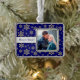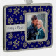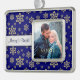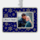 Pretty gold sparkly snowflake images of varying sizes are against a rich dark blue night sky, making a pretty background for your own photograph. A silver banner holds your custom text to personalise the ornament. Currently it says Merry & Bright, but you may change it to anything you'd like. Festive and elegant!
