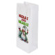 A funny and cheerful Christmas design showcases a jolly snowman dressed in a long green coat with a matching top hat, red scarf, and mittens. He holds a glass of red wine in one hand and white wine in the other. The festive red and green text reads, "Merry and bright." This design is available on a variety of products, making it a perfect gift for wine lovers.