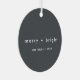 Simple, stylish, trendy "merry + bright" christmas tree ornament with modern minimalist typography in white on a charcoal grey background. The greeting, family name & year can be easily customised for a personal touch. A quirky, unique christmas card to stand out from the crowd!