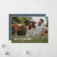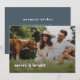 A stylish modern holiday photo flat greeting card with a bold retro typography quote "merry & bright" in white with a dusky smoke blue feature colour on the reverse. The greeting, name and message can be easily customised for a personal touch. A trendy, minimalist and contemporary design to stand out this holiday season! The image shown is for illustration purposes only to be replaced with your own photo. The placeholder image is of a happy young couple having a picnic with thier dog in a meadow.