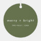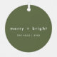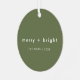 Simple, stylish, trendy "merry + bright" christmas tree ornament with modern minimalist typography in white on a dark moss green background. The greeting, family name & year can be easily customised for a personal touch. A quirky, unique christmas card to stand out from the crowd!
