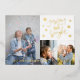 Personalised Merry and bright gold foil card. Design features simple white background with 3 portrait photos in the front and one landscape photo in the back. Front of card features family name and year.