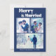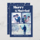 elegant merry and married 3 photos collage wedding blue Holiday Card