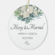 Introducing our "Merry & Married" Christmas Ornament, designed in a minimal and elegant style with modern script calligraphy. Featuring delicate white roses and sage green leaves, along with wedding rings at the bottom, this ornament can be personalised with the couple's names and wedding date. It's the perfect gift for friends and family to celebrate their special union during the holiday season. Ideal for newlyweds or anniversaries, this keepsake adds a meaningful and timeless touch to any Christmas tree.