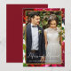 Beautiful dark burgundy red watercolor floral and greenery with elegant merry and married calligraphy Christmas holiday greeting, features the new couple's photo and their name in simple white text.