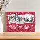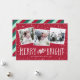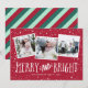 Festive holiday photo card features three square photos in a collage layout, with "merry and bright" in whimsical white lettering on a red background. Personalise with your names and the year along the bottom.