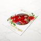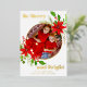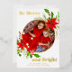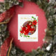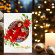 A beautiful red poinsettia floral with holly leaf encircles your cute family photo above Merry Christmas. Bright and cheerful kids photograph gold foil holiday cards with pretty flowers and leaves around your square picture.