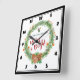 A Christmas clock with a watercolor wreath. Green pine needles, pine cones and decorative berries make up this festive wreath. Inside the wreath are some decorative ornaments and the words" may your days be Merry & Bright. Written in a trendy red font.