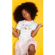 Thought the design was cute. After one wash with cold water on medium dry the decal flaked off and the shirt looks ornate. The tag says heavy duty cotton but the shirt doesn’t hold up. I would like a refund or my shirt remade. Horrible printing! Sadly the design did not stay on! Please refund me as for this price getting an unusable shirt is very disappointing.
