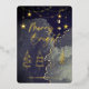 It features brushed script calligraphy text 'Merry + Bright' and pine tree doodles on the royal blue starry sky.