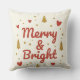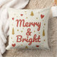 This is a cozy and cheerful square throw pillow featuring the classic holiday greeting "Merry & Bright" in a fun, mixed-font style. The design uses a festive color palette of vibrant red and metallic gold (or yellow-ochre) against a neutral cream background. The pattern is dotted with whimsical Christmas trees and small hearts, giving it a warm, hand-drawn, and slightly Scandinavian feel.