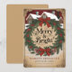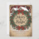 This "Merry & Bright Holiday Card" is a charming and elegant design that embodies the spirit of the Christmas season. The card features a beautifully illustrated wreath adorned with lush green pine branches, vibrant red berries, and golden pinecones. A rich red bow sits atop the wreath, adding a touch of sophistication and warmth.