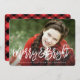 This seasonal photo card design features a full bleed image with a brushed hand lettered font overlay and a cosy buffalo plaid pattern on the back.