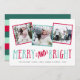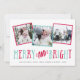 Festive holiday photo card features three square photos in a collage layout, with "merry and bright" in whimsical, vibrant red and turquoise lettering. Personalise with your names and the year along the bottom.