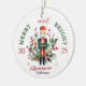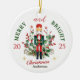 Bring timeless holiday charm to your tree with this Merry & Bright Christmas 2025 Personalized Name Ornament. This glossy acrylic has a modern, light-catching look featuring a classic nutcracker soldier standing among festive holly, pine greenery, and red berries. This design captures the spirit of the season in rich traditional colors of red, green, and gold. The elegant typography highlights “Merry & Bright Christmas 2025,” accented with sparkling gold stars for a magical touch.