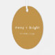 Simple, stylish, trendy "merry + bright" christmas tree ornament with modern minimalist typography in white on a rich ochre mustard yellow background. The greeting, family name and year can be easily customised for a personal touch. A quirky, unique christmas card to stand out from the crowd!