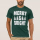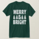 A festive Christmas graphic tee for women featuring modern typography with "Merry and Bright" saying with white pine trees. White text and green tshirt.