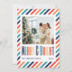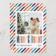 This Christmas Holiday Card features a retro colour typography text "merry & bright", the family's names, year, and photo on a retro stripes background.