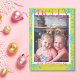 modern merry and bright. A colourful snowflake pattern with a single photo and distinctive typography. Personalised with your photo, family name, individual names, and a year.