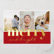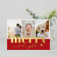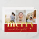 Elegant modern Christmas real gold foil holiday card featuring three photo collage and Holiday greeting in gold on the red background: Merry and bright, in a mix of classic typography and chic modern handwritten script. The reverse of the card has red and white stripes and contains your custom Christmas message with your last name and year. Customise this unique minimalist template by clicking on the ´´Personalise´´ button.