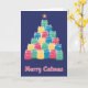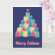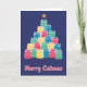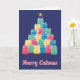 A colourful Christmas card featuring cats in the shape of a Christmas tree. Blue background. The wording at the bottom of the card says "Merry Catmas". Blank inside for your own message. Size 5" x 7".