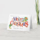 A very bright and cheerful Christmas card, with 'Merry Christmas' in large lettering on the white background, decorated with poinsettias, holly and ivy. The words, 'Merry Christmas' are filled with red and dark blue patterns And the rest of the front cover text is in grey, informal handwriting script. Please feel free to personalise the inside message.