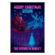 Futuristic Christmas poster design, Santa Claus wearing a modern red suit with glowing details and VR headset, riding a high-tech flying sleigh pulled by neon cyber
