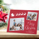 Festive red holiday folded card featuring 2 photos scattered in white frames, a white silhouette of reindeers flying Santa's sleigh, "Merry Christmas" in a stylish white script and your name in simple modern white typography. Add your custom message on the inside.