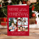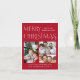 Elegant red folded holiday photo greeting card featuring "Merry Christmas" in stylish vintage white typography, "happy new year" and a greeting in modern white typography, three of your favourite family photos and your name. Personalise your seasonal message on the inside.