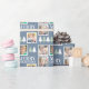This Christmas gift wrapping paper will add a fun personalised touch to your gift giving. The design offers 4 square photo frames and the text: Merry Christmas on a dusty blue background. The design is accented with small green and white trees.