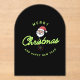 This image displays a "Merry Christmas and Happy New Year" greeting card with a striking and contrasting design. The deep black background highlights the word "Christmas," which is written large and bold in a bright, neon lime-green cursive style, accompanied by an illustration of a smiling Santa Claus head at the top. The overall design has a modern and festive feel, with essential red and green color accents for the celebration.