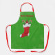 This kitchen apron is green with bearded gnome inside a red and white Christmas stocking with holly leaves and two candy canes. The text Merry Christmas is in red at the top.