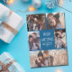 This cute, modern Merry Christmas card features a classy layout of 5 couple photos on a beautiful blue background with white typography. This beautiful family photo holiday card features your own photograph collage surrounding your message and family name.
