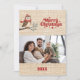 Beige faux burlap as background, red text. Text and photo on the front. Your text and names on the back. Merry Christmas is written with a retro style font. Decorated with a cute owl wearing a red scarf and beanie.