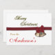 Classic red and white colours with gold script Merry Christmas and two bells with holly on a red ribbon. Beautiful clean and classic look.