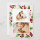 Festive berry botanical, multi-photo holiday card. Merry Christmas in red script. Card features, elegant watercolor frames of greenery and berries with coordinating pale pink colour backing. Single photo on front and two photos on back.