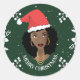 Merry Christmas, Black Woman, Red Santa Hat, Green Classic Round Sticker