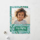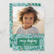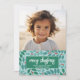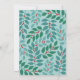 The front includes a photo with a trendy script font. The back includes a modern botanical pattern in teals and greens. The background colour can be changed in the advanced design area.