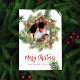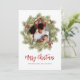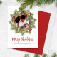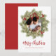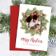 This design features Merry Christmas with merry Christmas holiday wreath with a modern photo family 1 one picture layout, simple elegant family minimalist, rustic green typography script red, a trendy botanical pine nature leaves, stylish trendy brush script font, simple watercolor greenery branches, Christmas holiday red holly berries, green winter foliage holly berry, Christmas holiday photo greeting cards