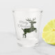 Unique, fashionable and trendy December winter holiday shot glass with a cute image of a green and black Buffalo Check patterned male deer silhouette and Merry Christmas wish in an elegant stylist typography font script.
